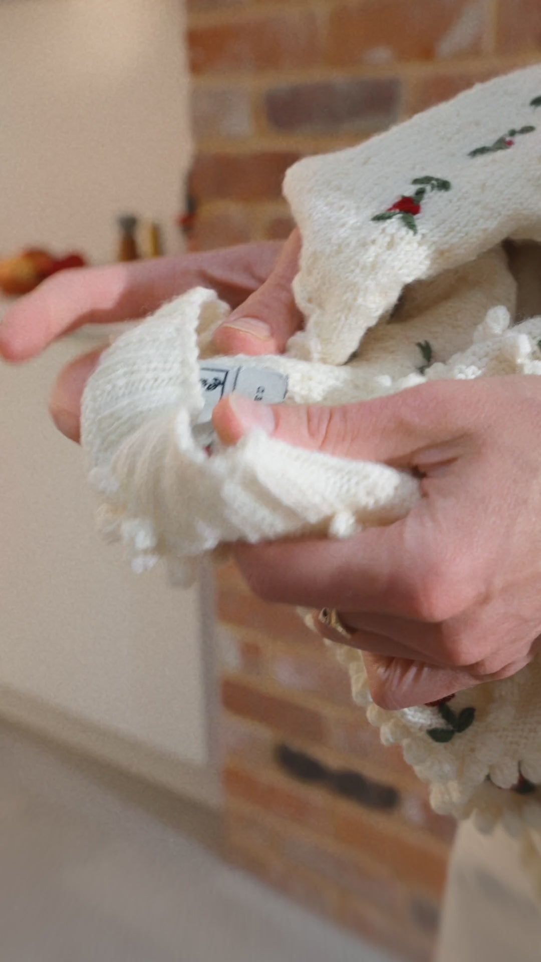 Delicate hand-embroidered roses in red and sage bloom gently across the knit, each petal stitched slowly by hand — a small act of devotion repeated again and again.
