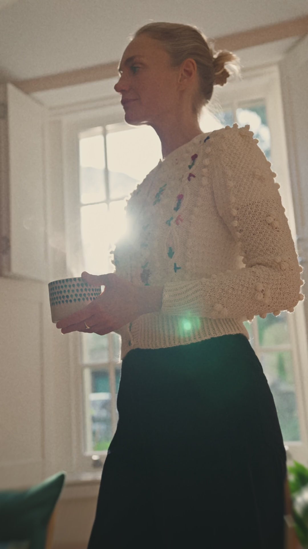A joyful love letter to Alpine meadows in bloom: hand-knitted in cloud-soft wool with hundreds of raised bobbles that recall fresh snow beneath your fingers, then brought to life with a cascade of hand-embroidered wildflowers in rose, buttercup, and sage. From afar, it feels like quiet cream and soft luxury; up close, it becomes a garden you can wear.